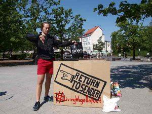 Die Aktivist*innen der belgischen CCC-Organisation achACT gehen auf´s Ganze. Mit der Forderung „Living Wage Now!“ machen Sie in der Shopping Zone auf die nackten Tatsachen der Ausbeutung in der Bekleidungsproduktion aufmerksam.