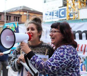 2018 erinnerten Aktivist*innen der Kampagne für Saubere Kleidung in ganz Deutschland den Moderiesen H&M endlich existenzsichernde Löhne zu bezahlen! 2013 hatte das Unternehmen öffentlichkeitswirksam angekündigt, dass bis 2018 rund 850.000 Arbeiter*innen in Gold- und Platin-Zulieferbetrieben einen Existenzlohn bekommen sollten – eingehalten wurde das Versprechen jedoch nicht. Die Regionalgruppen der Kampagne haben in Berlin, Bonn, Dresden, Greifswald, Hannover, Mannheim, Münster, Neumünster kreative Straßenaktionen durchgeführt und H&M im Rahmen einer weltweiten Protestkampagne unter Druck gesetzt. Koordiniert wurden die Aktionen durch das Entwicklungspolitische Netzwerk Sachsen (ENS). Vivien Tauchmann vom ENS nahm am 3. Juli nun stellvertretend für alle Aktivist*innen den Aktionspreis Spitze Nadel in Berlin entgegen.