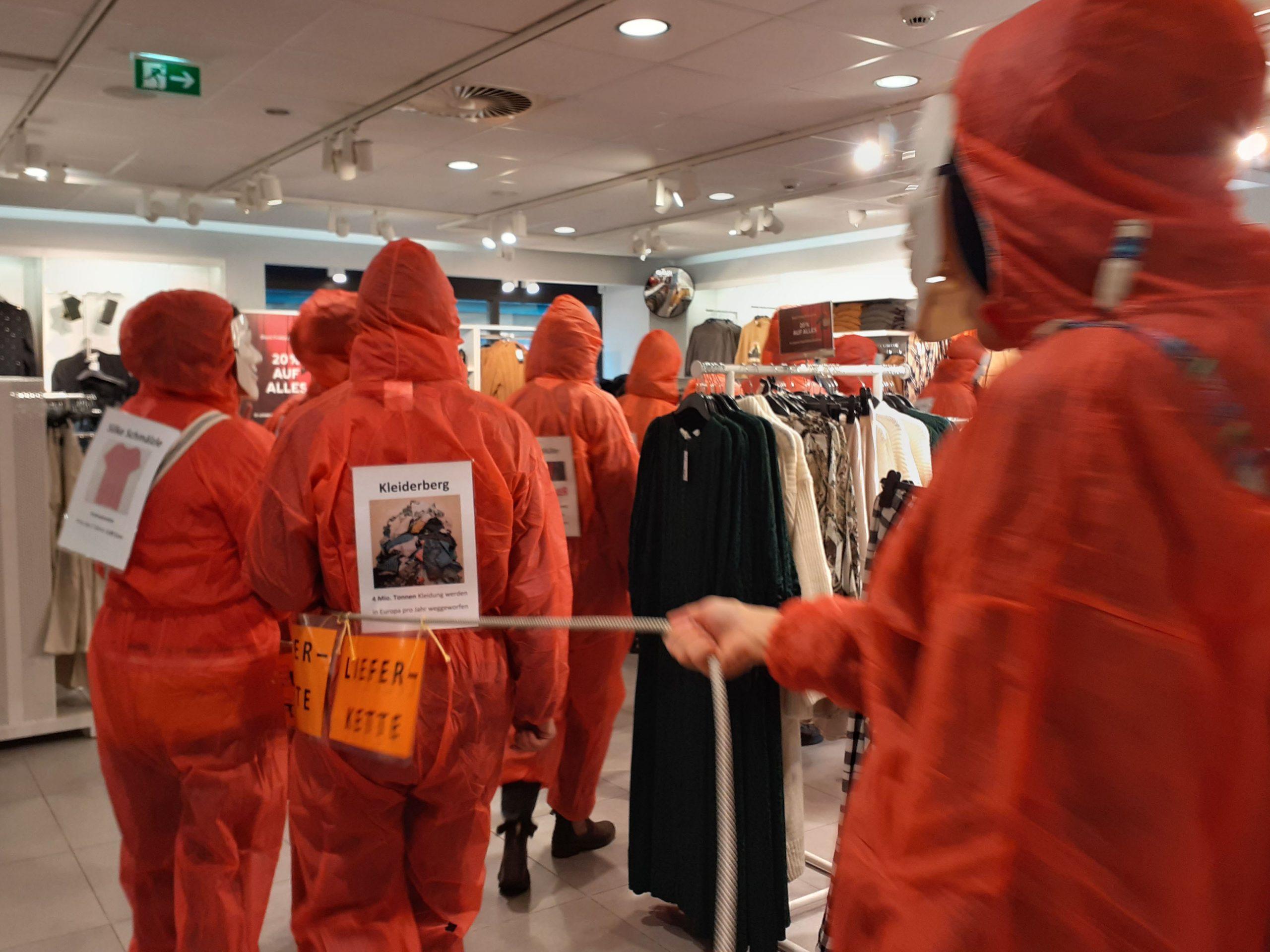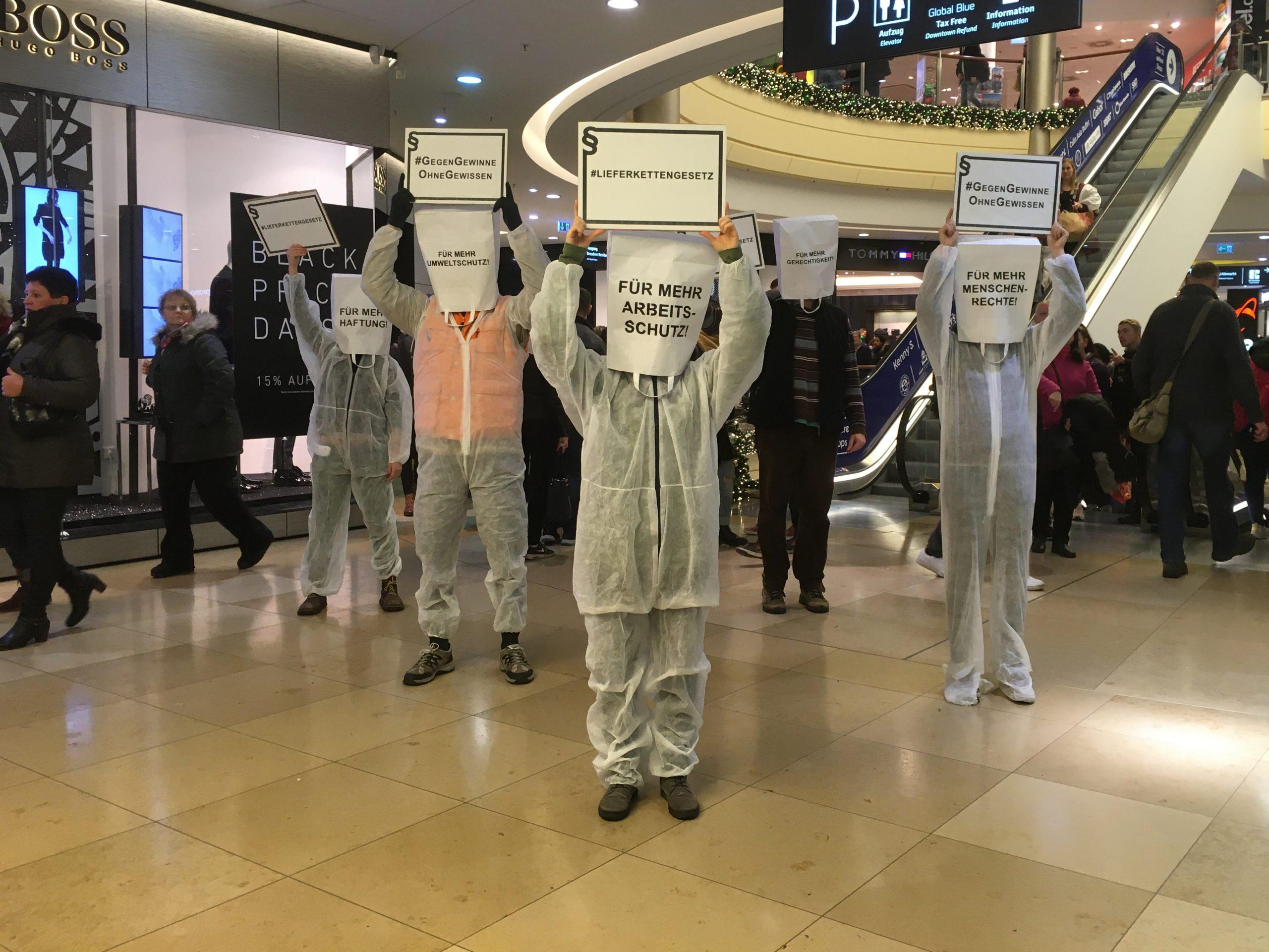 Rund um den Black Friday protestierten Aktivist*innen der Kampagne für Saubere Kleidung mit einem Flashmob dagegen, dass Unternehmen Menschenrechtsverletzungen und Umweltzerstörung in Kauf nehmen, um in Deutschland billige Produkte zu verkaufen.