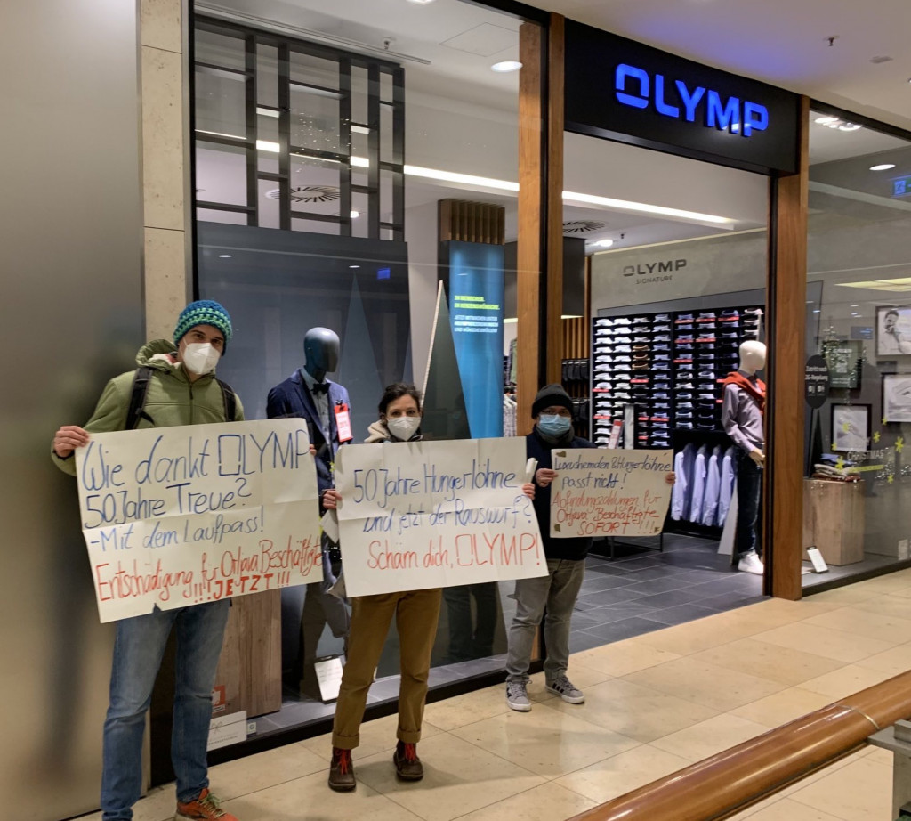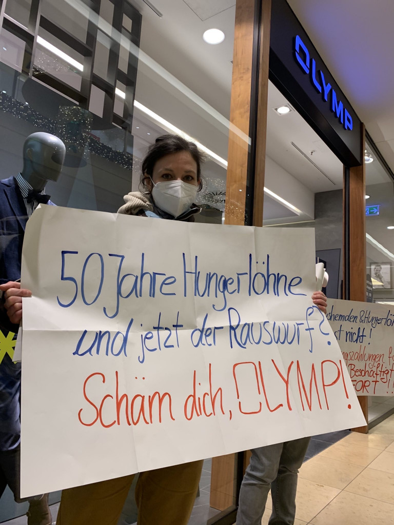Die Kommunikation der Clean Clothes Campaign mit Olymp begann im Mai 2021. Seitdem haben wir etwa ein Dutzend E-Mails ausgetauscht, und dennoch hat Olymp keine Bereitschaft gezeigt, die Produktion fortzusetzen. Sie waren sogar unhöflich und vermieden eindeutig die Kommunikation mit CCC und Novi Sindikat, einer Gewerkschaft vor Ort, indem sie drohten, mit dem Insolvenzverwalter zu sprechen.