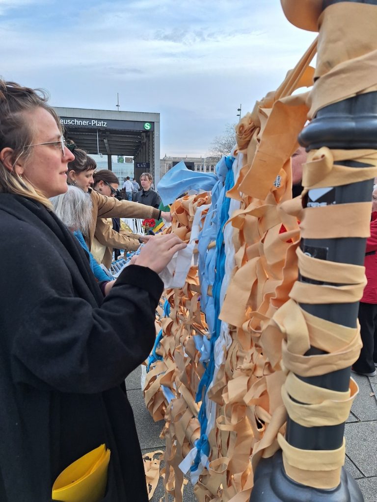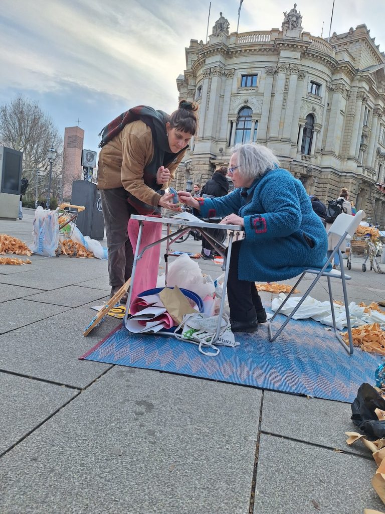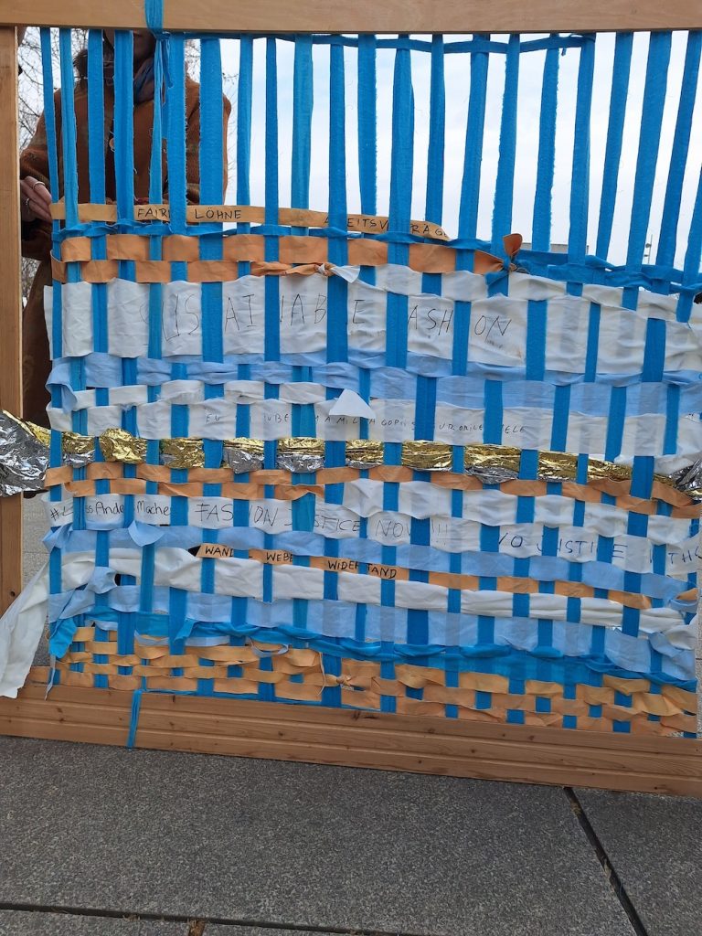 Unvergesslich blieb zudem die aktivistische Aktion in der Leipziger Innenstadt. Bereits am Freitagabend bereiteten wir, gemeinsam mit dem Kollektiv Loom Loop, textile „Kunstobjekte“ vor, indem wir alte Stoffe in großformatige Webrahmen oder Einkaufswägen einarbeiteten. Am Samstag war ich dann tatsächlich zum ersten Mal selbst aktivistisch auf der Straße unterwegs. Wir inszenierten symbolisch eine Textilfabrik, riefen Slogans per Lautsprecher, verteilten Informationsmaterial und luden Interessierte ein, eigene Botschaften und Wünsche in das Gewebe einzuflechten. Dabei sprachen wir mit Passant*innen über Arbeitsrechte, Konsumverhalten und Alternativen zur Fast Fashion. Viele beschrieben dabei ihren Zwiespalt: Sie wissen um die Missstände der Branche und den nötigen Wandel, kämpfen aber damit, ihr eigenes Kaufverhalten in unserer konsumorientierten Gesellschaft tatsächlich zu ändern.