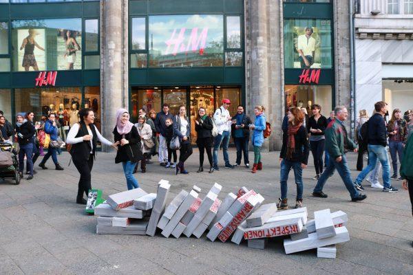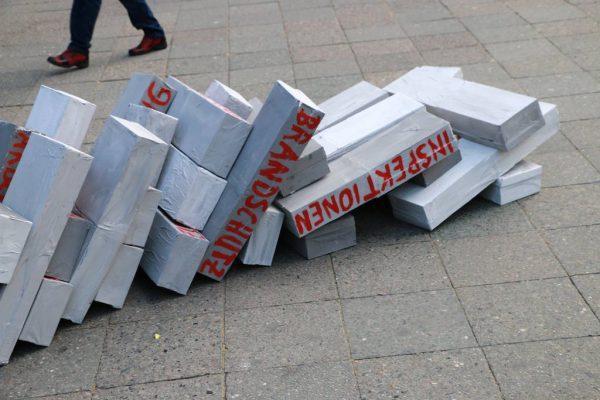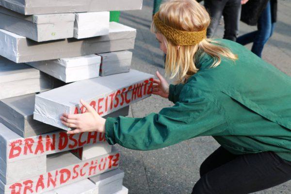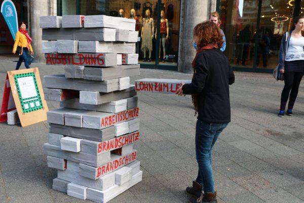 „Brandschutz“, „Fluchtwege“, „Lohn zum Leben“, „Inspektionen“, „Arbeitsschutz“ – alles wichtige Bestandteile der Sicherstellung menschenwürdiger Arbeitsbedingung. Mit einem riesigen Jenga-Spiel haben Aktive immer wieder verdeutlicht, wie wichtig diese „Bausteine“ sind für menschenwürdige Arbeitsbedingungen in den Lieferketten der Modeindustrie. Zieht man einen Stein nach dem anderen heraus – stützt es in sich zusammen. Die Idee hatte unsere Berliner Aktionsgruppe und es bietet sich u. a. für Straßenaktionen an. Die Jengateile haben sie aus Schuhkartons gebastelt. Probier’s mal aus!